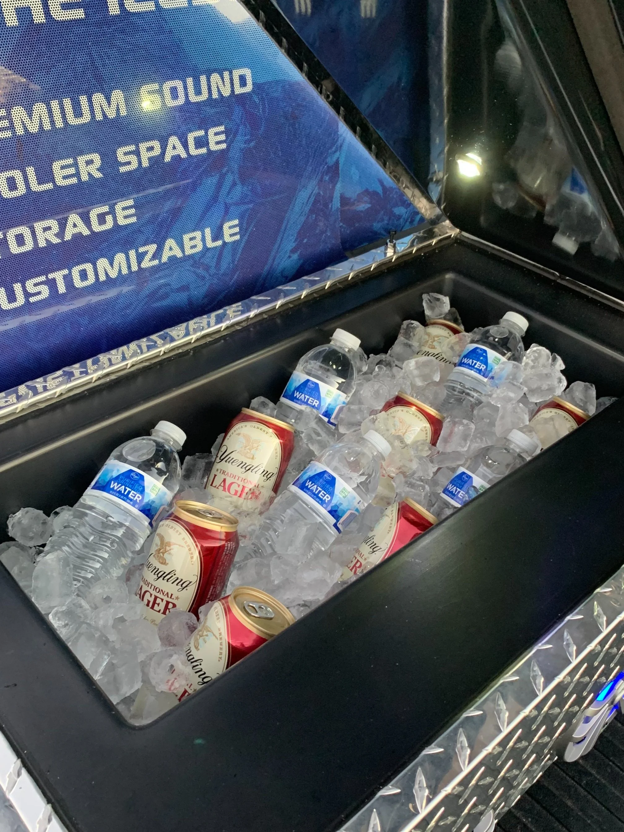 Iceburg is a fully integrated entertainment system for your truck, with premium sound, cooler storage, and an extra compartment for all your tailgating gear.